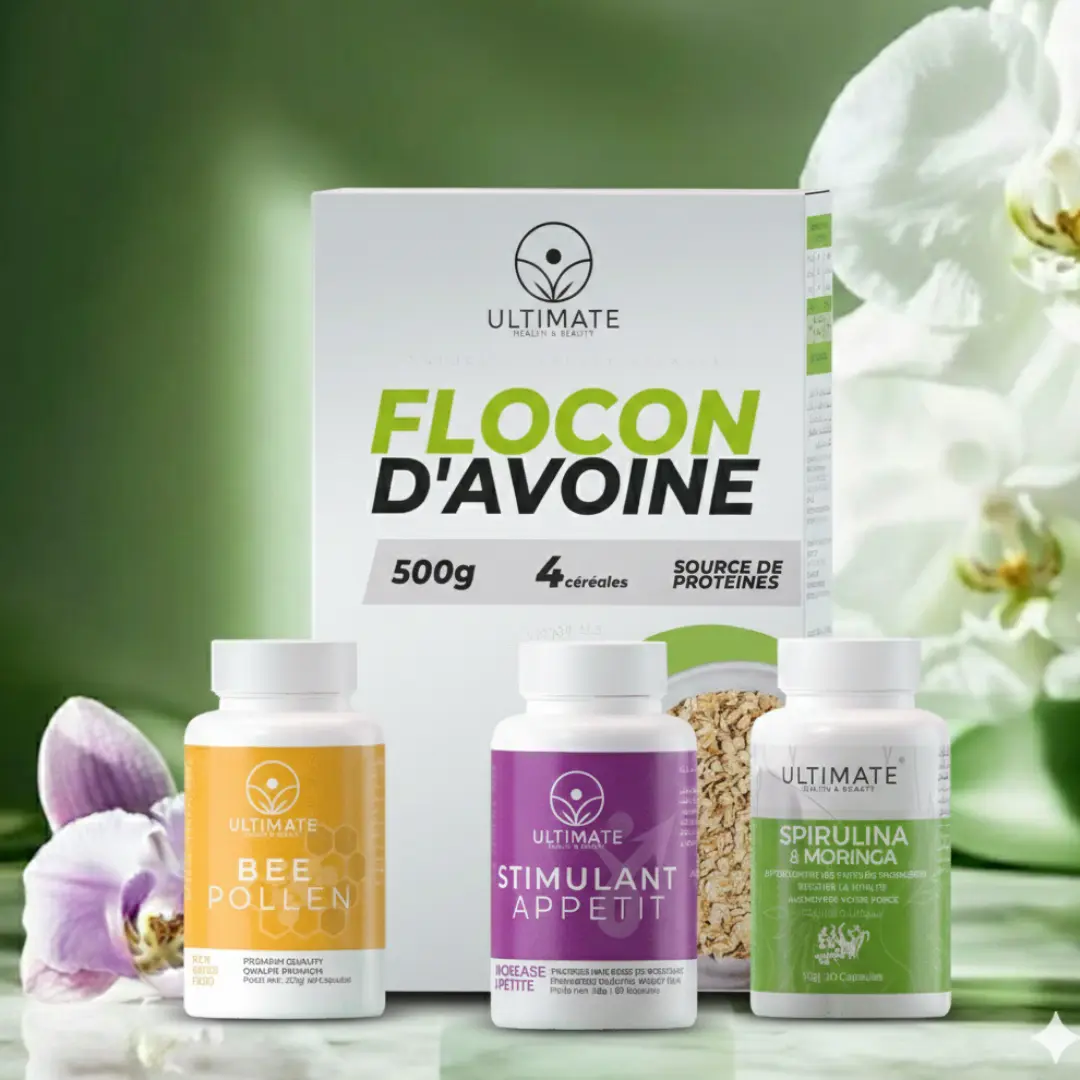 تجمع هذه الباقة بين قوة الطبيعة والعلم لتقديم نظام غذائي متكامل يستهدف الأسباب الرئيسية للنحافة 🧬. تضم الباقة مزيجاً من المكملات الغذائية المختارة بعناية لفتح الشهية، تعزيز امتصاص المغذيات، وإمداد الجسم بالبروتينات والمعادن الضرورية لبناء كتلة جسمانية صحية 💪. مع "Stimulant Appétit" لفتح الشهية 🍽️، و "Bee Pollen" للقيم الغذائية 🐝، و "Spirulina & Moringa" للطاقة ⚡، بالإضافة إلى "Flocon d'Avoine" كمصدر أساسي للكربوهيدرات والبروتين 🥣، ستحصل على كل ما يحتاجه جسمك للتغير.